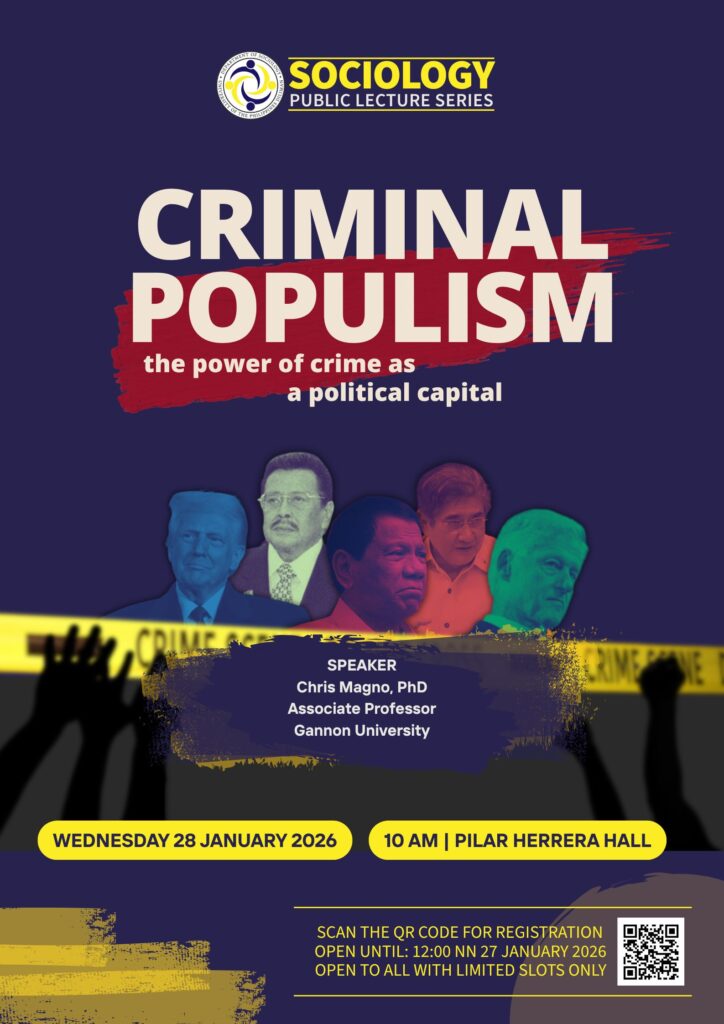 The Department of Sociology invites the public to attend the lecture entitled “Criminal Populism: The Power of Crime as a Political Capital,” featuring Dr. Chris Magno, Associate Professor at Gannon University. The lecture will be held on Wednesday, 28 January 2026, 10:00 AM at the Pilar Herrera Lecture Hall (inside…