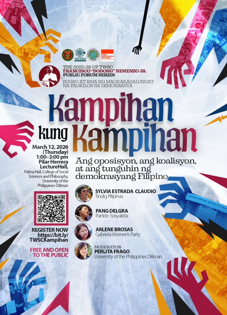 The UP Third World Studies Center, in collaboration with the Rosa-Luxemburg-Stiftung Southeast Asia, invites the public to ๐๐ฎ๐บ๐ฝ๐ถ๐ต๐ฎ๐ป ๐๐๐ป๐ด ๐๐ฎ๐บ๐ฝ๐ถ๐ต๐ฎ๐ป: ๐๐ป๐ด ๐ข๐ฝ๐ผ๐๐ถ๐๐๐ผ๐ป, ๐ฎ๐ป๐ด ๐๐ผ๐ฎ๐น๐ถ๐๐๐ผ๐ป, ๐ฎ๐ ๐ฎ๐ป๐ด ๐บ๐ด๐ฎ ๐ง๐๐ป๐ด๐๐ต๐ถ๐ป ๐ป๐ด ๐๐ฒ๐บ๐ผ๐ธ๐ฟ๐ฎ๐๐๐ฎ๐ป๐ด ๐๐ถ๐น๐ถ๐ฝ๐ถ๐ป๐ผ, the fourth and final installment of the ๐ฎ๐ฌ๐ฎ๐ฑ-๐ฎ๐ฒ ๐จ๐ฃ ๐ง๐ช๐ฆ๐ ๐๐ฟ๐ฎ๐ป๐ฐ๐ถ๐๐ฐ๐ผ โ๐๐ผ๐ฑ๐ผ๐ป๐ดโ ๐ก๐ฒ๐บ๐ฒ๐ป๐๐ผ ๐๐ฟ. ๐ฃ๐๐ฏ๐น๐ถ๐ฐ ๐๐ผ๐ฟ๐๐บ ๐ฆ๐ฒ๐ฟ๐ถ๐ฒ๐: ๐๐๐ด๐๐ผ ๐ฎ๐…