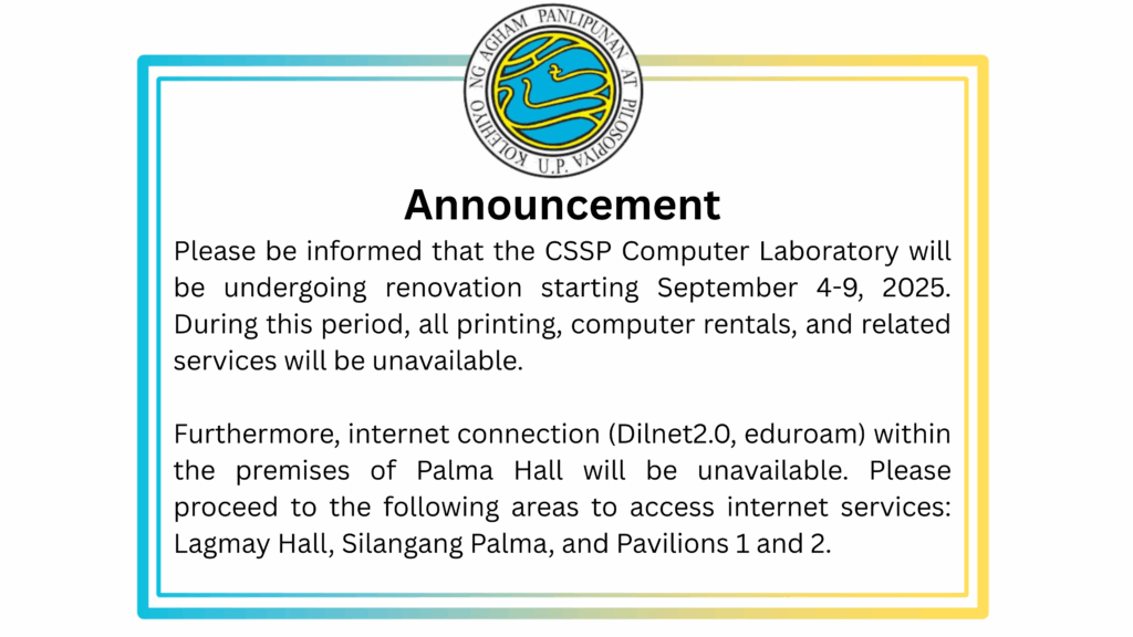 Please be informed that the CSSP Computer Laboratory will be undergoing renovation starting September 4 to 9, 2025. During this period, all printing, computer rentals, and related services will be unavailable.