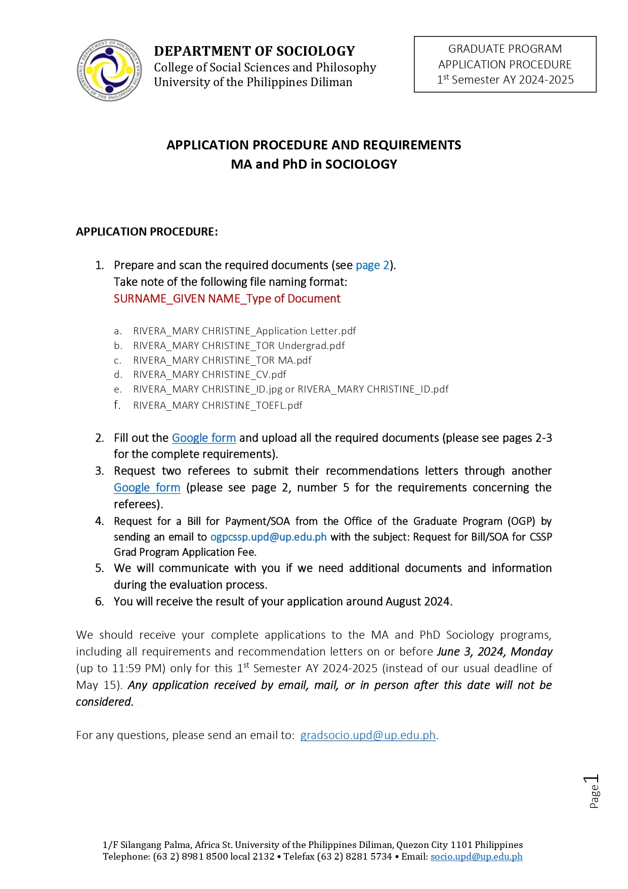 We are temporarily accepting online applications for admission until further notice. Please read the following carefully. For any questions, please send an email to: gradsocio.upd@up.edu.ph